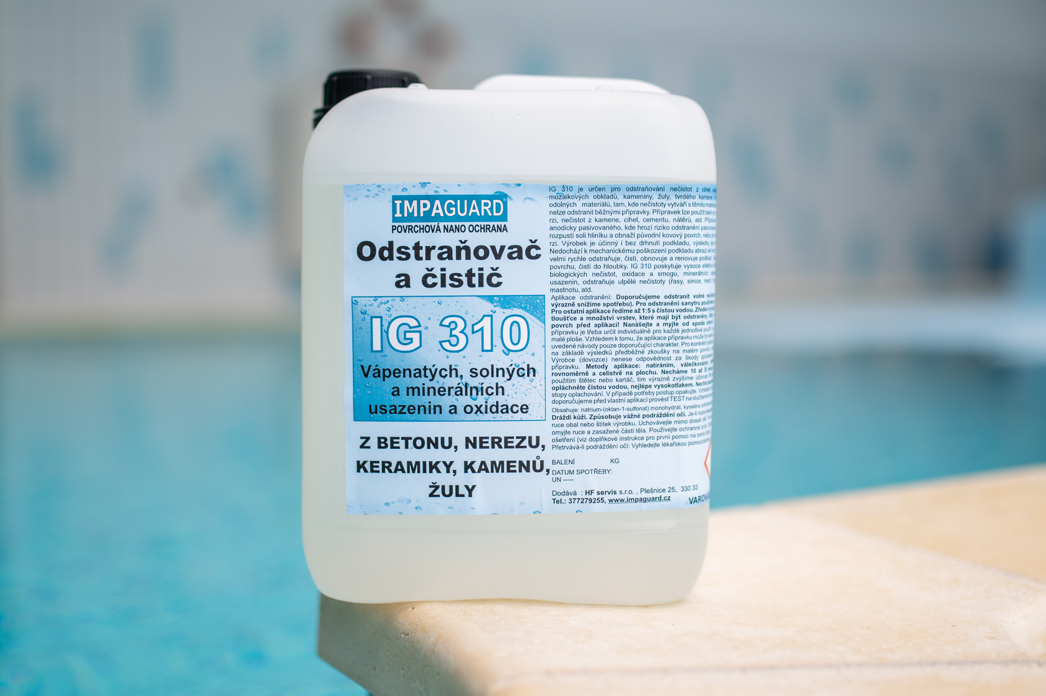 IG 310 poskytuje vysoce efektivní čištění a odstranění vodního kamene, biologických nečistot, oxidace, smogu, atmosférických nečistot, kyselých mastnot, odolné špíny a minerálních a vápenatých usazenin. Odstraňuje ulpělé nečistoty (řasy, sinice, mech, hmyz) a ztmavnutí povrchu. Vhodný spíše k čištění v exteriéru. Očištěné povrchy doporučujeme ochránit produkty IG 223, IG 227, IG 568 nebo IG 335 dle typu povrchu. V případě nerez oceli a hliníku produktem IG 442.