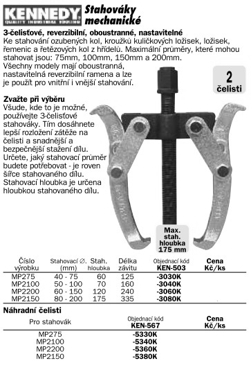 3-čelisťové, reverzibilní, oboustranné, nastavitelné Ke stahování ozubených kol, kroužků kuličkových ložisek, ložisek, řemenic a 5etězových kol z hřídelů. Stahovací průměr 40-75mm, stahovací hloubka 60mm, délka závitu 125mm.