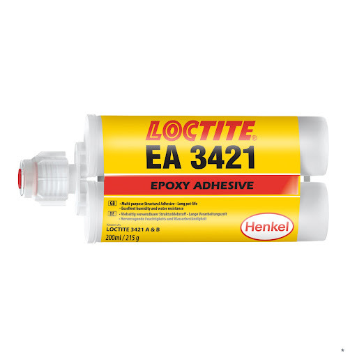 Dvousložkové epoxidové lepidlo Hysol - Loctite 3421, které pomalu vytvrzuje po zamíchání složek při pokojové teplotě. Je to zatékavé lepidlo určené pro všeobecné lepení, které poskytuje vysokou pevnost a vynikající odolnost vůči vlhkosti. Dlouhá doba zpracovatelnosti a střední viskozita činí tento produkt velmi vhodným pro lepení velkých ploch, které potřebují hodně času na přesné ustavení.Vysoká plnící schopnost tohoto lepicího systému umožňuje spojovat drsné a nedoléhavé plochy z oceli, mědi, mosazi, keramiky, dřeva nebo tuhého plastu.