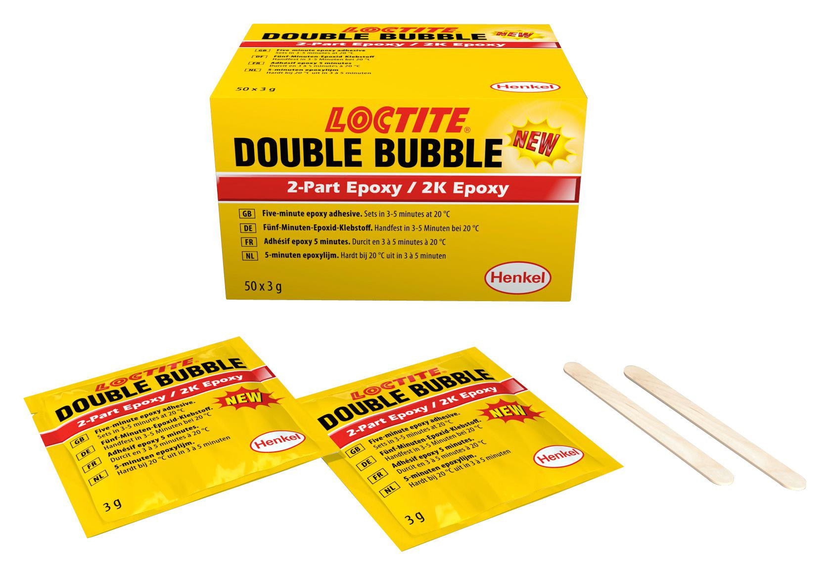 Loctite Double Bubble je rychle vytvrzující dvousložkové epoxidové lepidlo pro všeobecné použití na rychlé opravy. Lze s ním lepit širokou škálu materiálů, např. dřevo, kovy, sklo, keramiku a některé plasty. Dodává se v jednorázovém dvojitém sáčku pro snadnou manipulaci spolu s míchací podložkou a dřevěnou špachtlí. Obal zabezpečuje správný mísicí poměr složek lepidla.