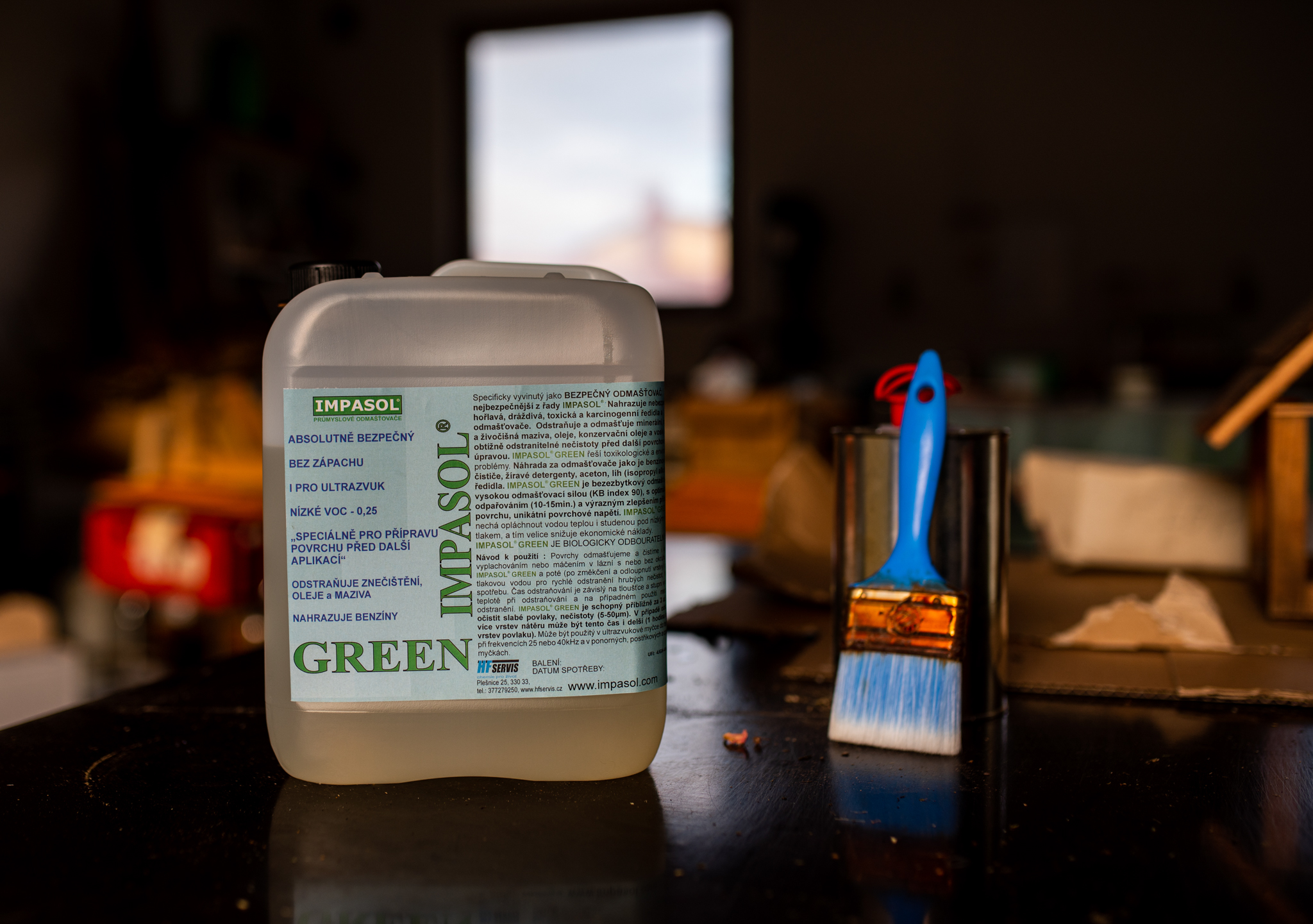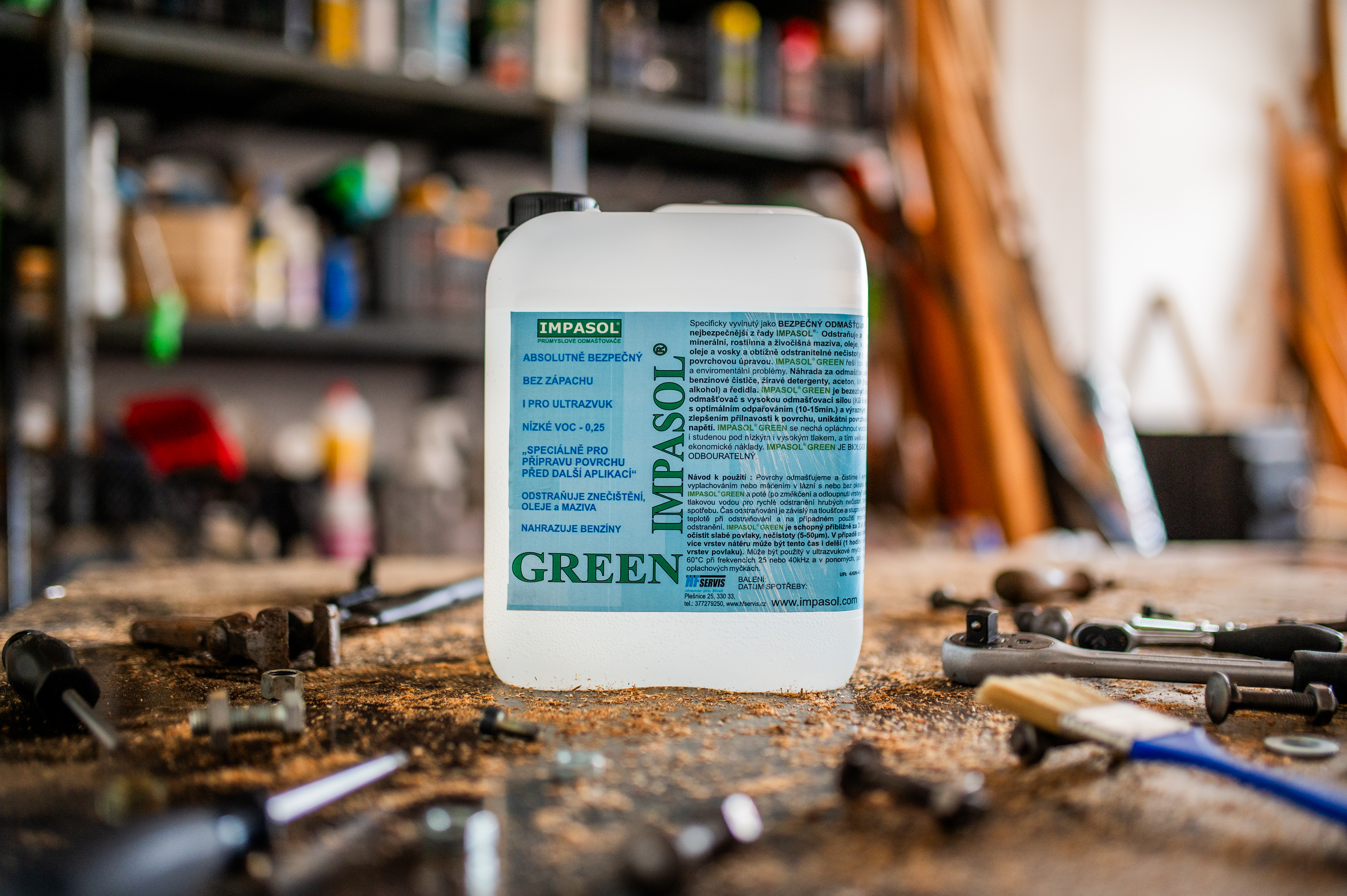 IMPASOL GREEN je absolutně bezpečný, nehořlavý, bezezbytkový, odmašťovač s vysokou odmašťovací silou. Odstraňuje a odmašťuje minerální, rostlinná a živočišná maziva, oleje, konzervační oleje a vosky a obtížně odstranitelné nečistoty před další povrchovou úpravou.