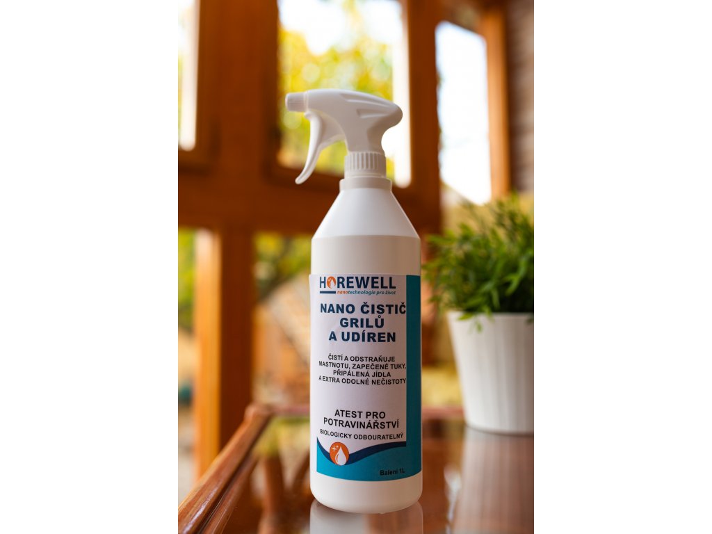 NANO ČISTIČ GRILŮ A UDÍREN je neabrazivní a nežíravý silný čistič znečištěných ploch grilů a udíren, domácích i průmyslových. V jediném úkonu velmi rychle čistí, odmašťuje a vysokou alkalicitou i dezinfikuje podklad (bez obsahu dezinfekčních složek). Odstraňuje mastnotu, oleje, tuky a připálené zbytky jídla z nerezových, hliníkových a litinových povrchů, barev i barvených kovů. Díky svému nano polymerovému složení čistí do hloubky. Jeho autoaktivní pěnová konzistence je ideální pro použití na svislých stěnách, kde snižuje spotřebu a zvyšuje efektivitu čištění. Je účinný i bez drhnutí, nedochází k mechanickému poškození podkladu, jako se tomu děje u žíravých prostředků.