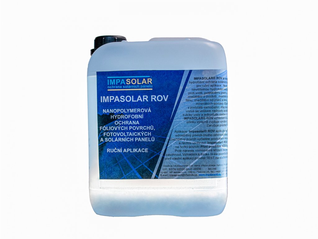 IMPASOLAR® ROV je nanopolymerová hydrofobní ochrana solárních a fotovoltaických panelů pro ruční aplikace. Na povrchu vytváří neviditelnou hydrofobní vrstvu s ochranou proti vodě, polétavému prachu a písku, pylu, znečištění z ovzduší, mastnému dopravnímu filmu, znečištění od ptáků a hmyzu, usazování minerálních povlaků. Ošetřený panel je v podstatě samočistící, díky neviditelné nano vrstvě se veškeré nečistoty za deště nabalí na kuličky vody a jednoduše stečou z povrchu pryč. IMPASOLAR® ROV vzhledem k samočistícímu účinku výrazně zvyšuje výrobní výkon panelů. Zaručuje průchod 100 % světla.