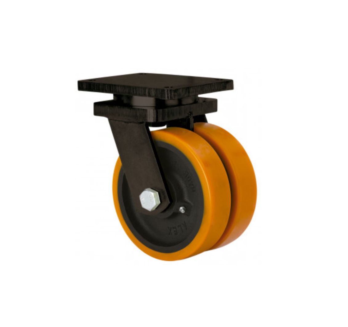 Dvojité koleso s oceľovým stredom a liatou polyuretánovou pneumatikou s tvrdosťou 95º Shore A, špeciálne navrhnuté pre ťažké náklady do 2 500 kg.