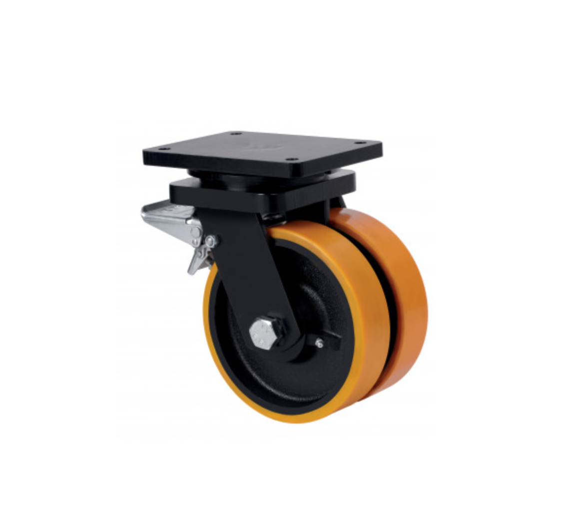 Dvojité koleso s oceľovým stredom a liatou polyuretánovou pneumatikou s tvrdosťou 95º Shore A, špeciálne navrhnuté pre ťažké náklady do 2 500 kg.
