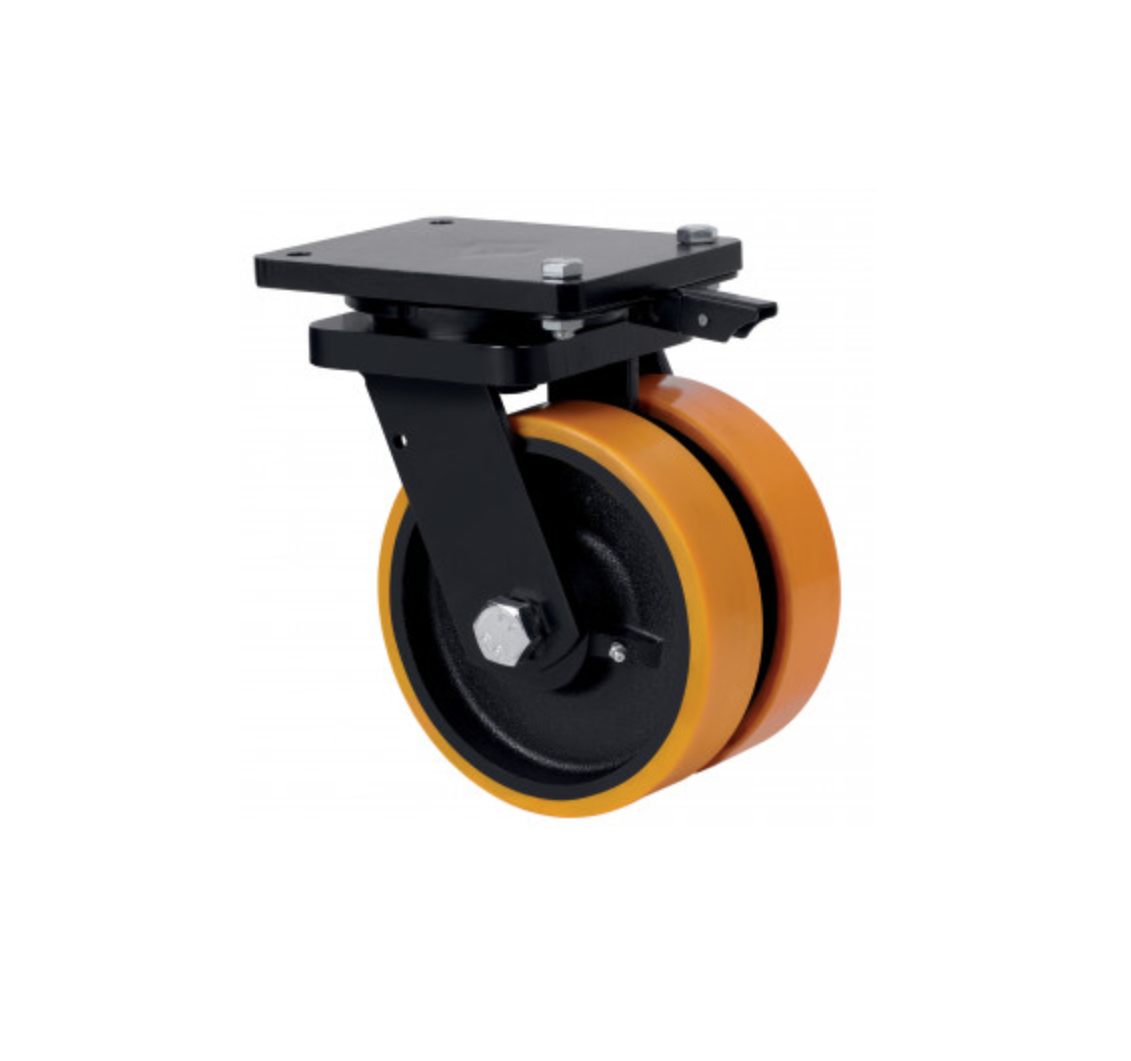 Dvojité koleso s oceľovým stredom a liatou polyuretánovou pneumatikou s tvrdosťou 95º Shore A, špeciálne navrhnuté pre ťažké náklady do 2 500 kg.