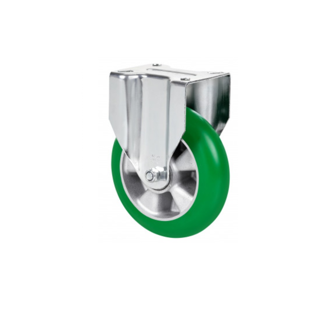 Kolieska s hliníkovým stredom a zelenými polyuretánovými pneumatikami s tvrdosťou 80º podľa Shoreho tvrdosti A, navrhnuté špeciálne pre ťažké náklady do 650 kg.