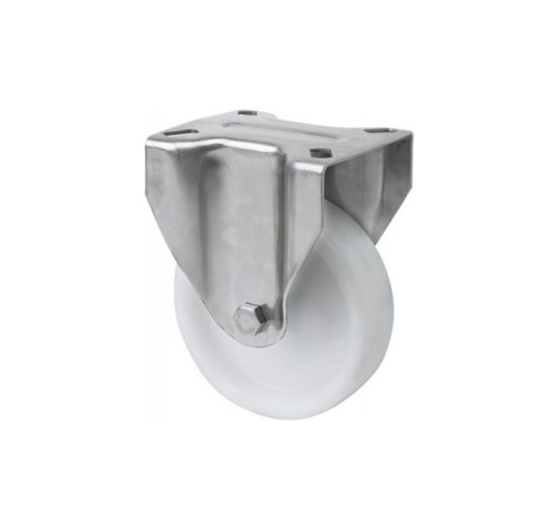 Biele polypropylénové kolieska s komponentmi z nehrdzavejúcej ocele (AISI 304), najmä pre ťažké náklady do 400 kg.