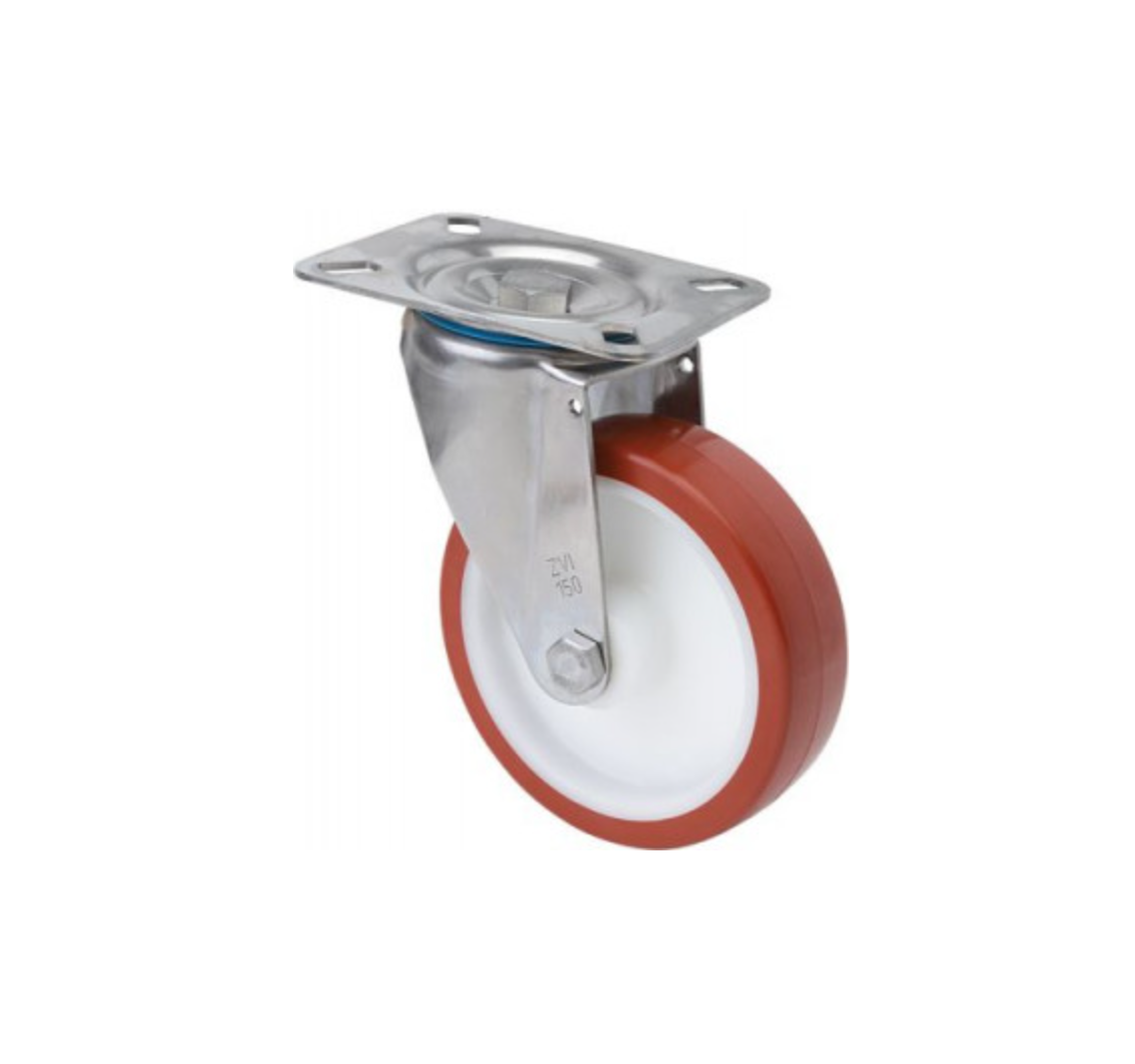 Vstrekované polyuretánové kolieska s komponentmi z nehrdzavejúcej ocele (AISI 304). Špeciálne navrhnuté pre vysoké zaťaženie do 300 kg.