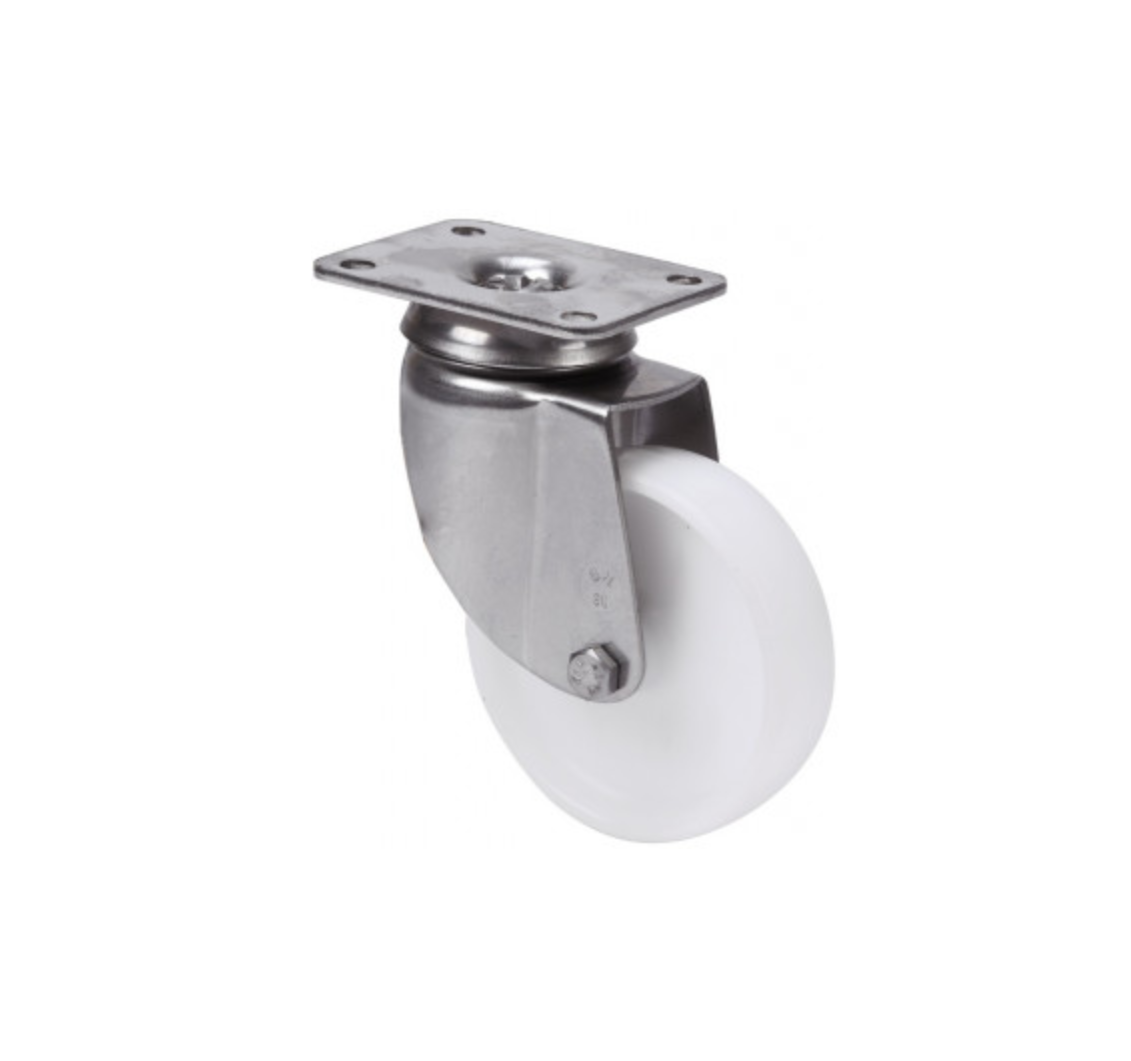 Biele polypropylénové kolieska s komponentmi z nehrdzavejúcej ocele (AISI 304), špeciálne navrhnuté pre vysoké zaťaženie do 80 kg.