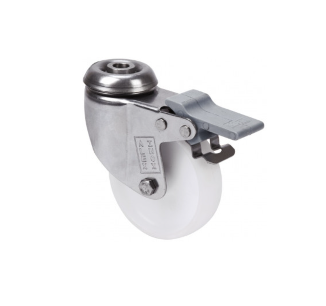 Biele polypropylénové kolieska s komponentmi z nehrdzavejúcej ocele (AISI 304), špeciálne navrhnuté pre vysoké zaťaženie do 80 kg.