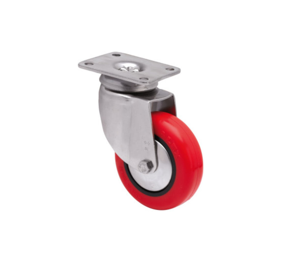 Injektované polyuretánové kolieska s polypropylénovým stredom a komponentmi z nehrdzavejúcej ocele (AISI 304), špeciálne navrhnuté pre vysoké zaťaženie do 80 kg.