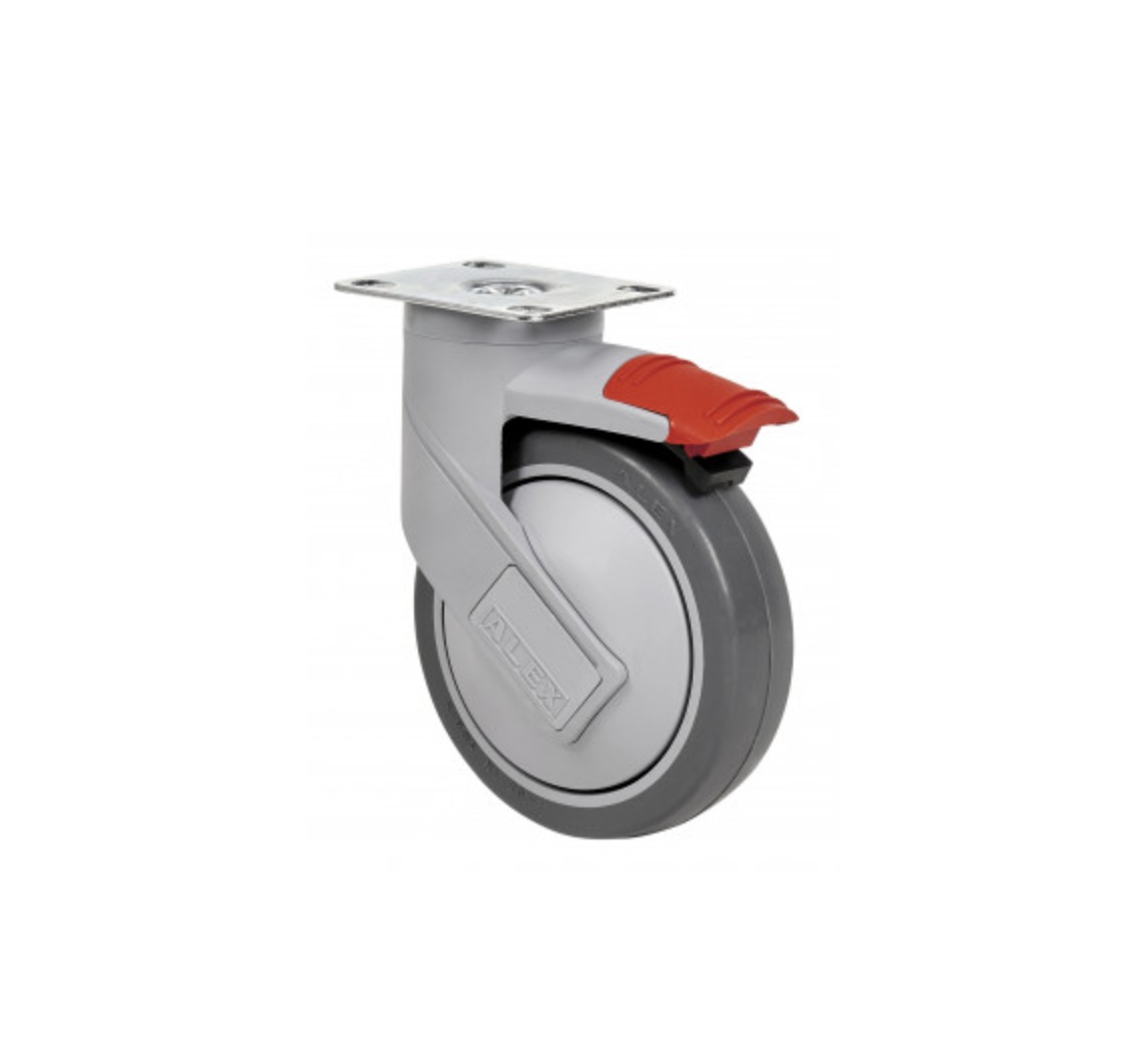 Šedé termoplastové kolesá so vstrekovanou gumou. Puzdro vyrobené z vysokokvalitného polyamidu vystuženého sklenými vláknami. Špeciálne navrhnuté pre zaťaženie do 100 kg.