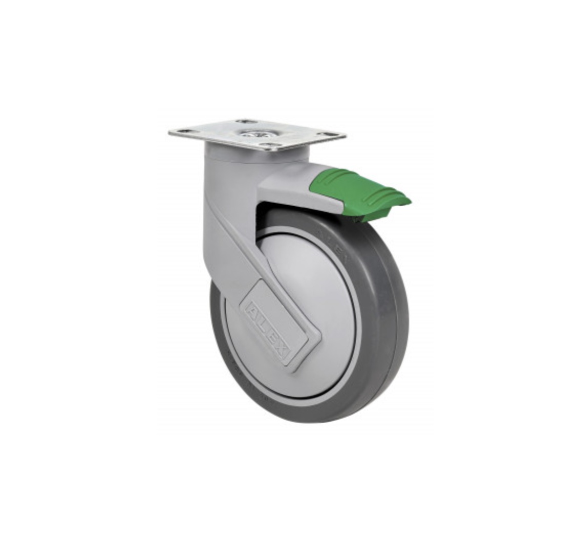 Šedé termoplastové kolesá so vstrekovanou gumou. Puzdro vyrobené z vysokokvalitného polyamidu vystuženého sklenými vláknami. Špeciálne navrhnuté pre zaťaženie do 100 kg.
