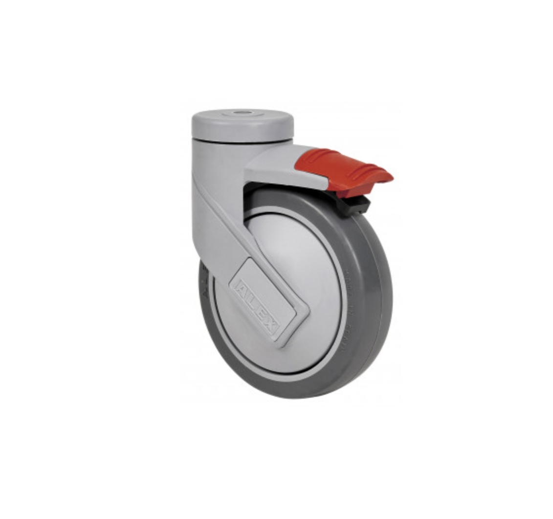 Šedé termoplastové kolesá so vstrekovanou gumou. Puzdro vyrobené z vysokokvalitného polyamidu vystuženého sklenými vláknami. Špeciálne navrhnuté pre zaťaženie do 100 kg.