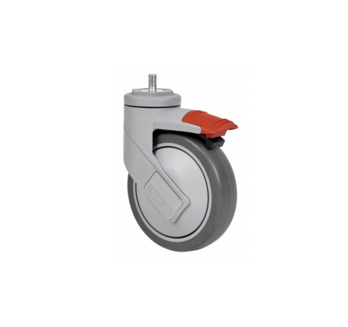 Šedé termoplastové kolesá so vstrekovanou gumou. Puzdro vyrobené z vysokokvalitného polyamidu vystuženého sklenými vláknami. Špeciálne navrhnuté pre zaťaženie do 100 kg.