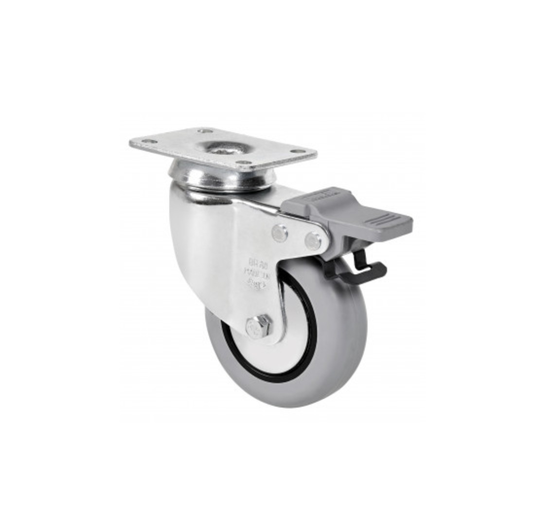 Šedé gumené kolesá so vstrekovaním. Špeciálne navrhnuté pre náklad do 70 kg.