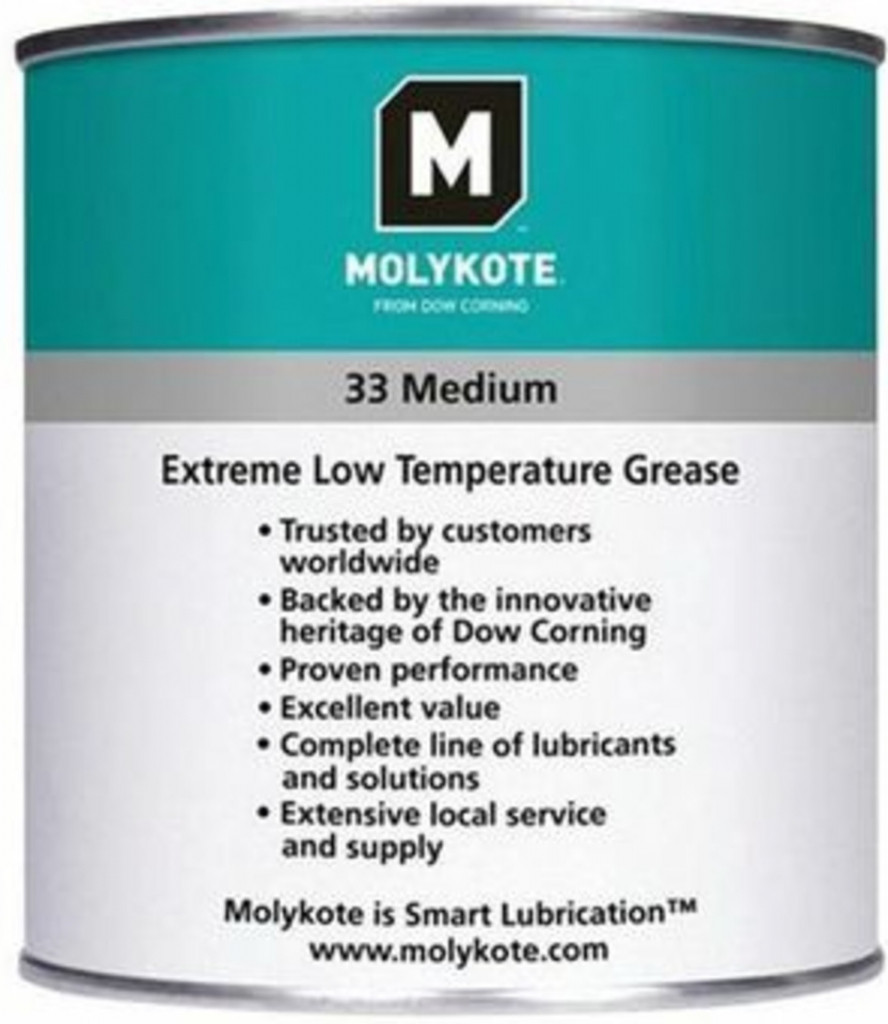 Molykote 33 Medium je vynikající minerální mazivo (silikonový tuk) na kov a plasty, který výborně snáší velmi vysoké teploty (až +180°C), ale své vynikající schopnosti si zachovává i v hlubokém mrazu (až -73°C).