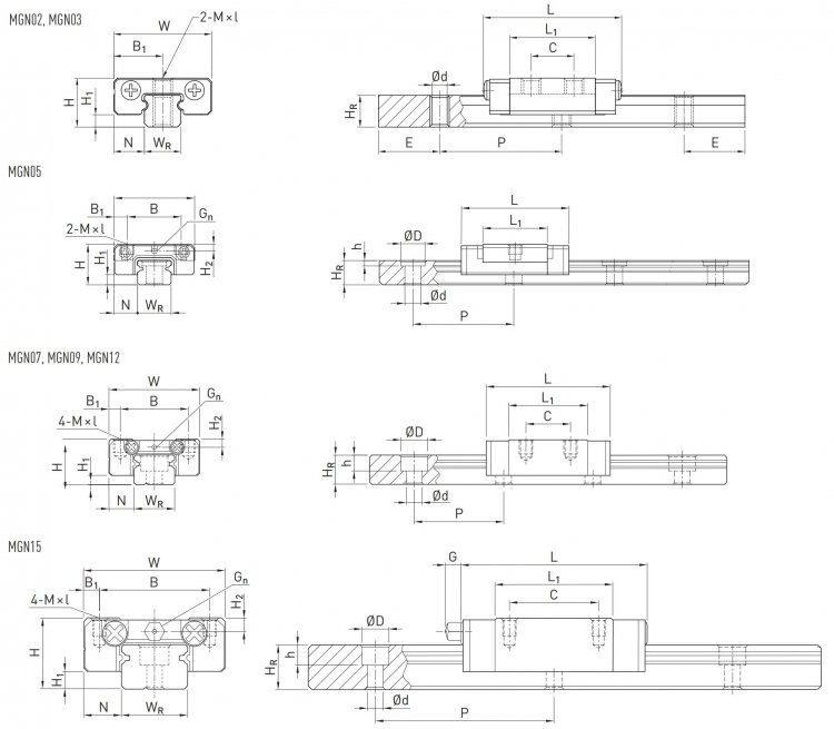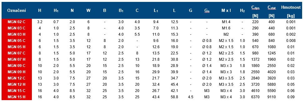 Schmale, platzsparende Miniaturführung, standardmäßig aus korrosionsbeständigem Stahl, für den Einsatz in kleinen Geräten. Alle Stahlteile der Miniaturführung MGN sind standardmäßig aus korrosionsbeständigem, martensitischem Stahl aufgebaut.