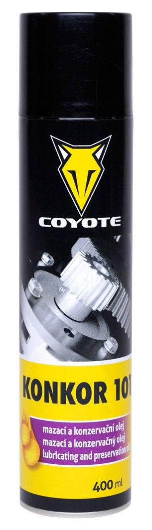 Coyote Konkor 101 vytváří na konzervovaných předmětech olejový film, který maže a současně dokonale chrání železné i neželezné kovy jako ocel, litina, měď, zinek a olovo. Je hodný k mazání strojů, přístrojů, motorů, náhradních dílů, kontaktů akumulátorů i pantů.