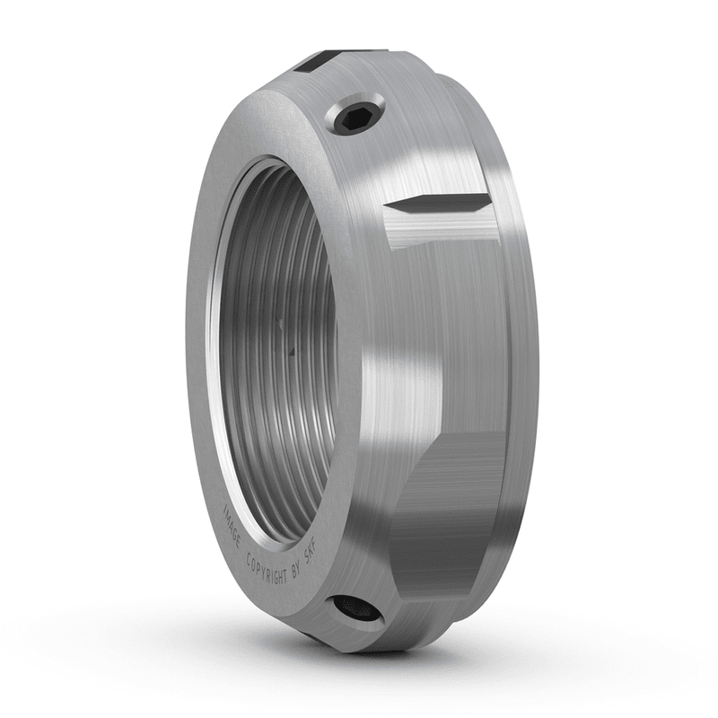 Poistné matice KMT a KMTA sú určené na aplikácie, kde sa vyžaduje vysoká presnosť, jednoduchá montáž a spoľahlivé zaistenie. Tri rovnomerne rozmiestnené poistné kolíky umožňujú presné ustavenie týchto poistných matíc v pravom uhle k hriadeľu. Možno ich však nastaviť aj tak, aby kompenzovali mierne uhlové odchýlky súvisiacich súčastí.