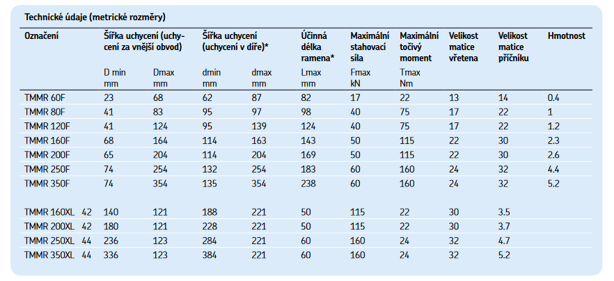 Osem sťahovákov TMMR..F v štandardnom sortimente pokrýva širokú škálu veľkostí ložísk a komponentov. Okrem toho sa štyri najväčšie veľkosti štandardne dodávajú s mimoriadne dlhými ramenami (TMMR ....XL), ktoré ešte viac rozširujú všestrannosť sťahováka. Veľmi dlhé ramená uľahčujú demontáž ložísk a komponentov, ktoré sú umiestnené ďaleko od konca hriadeľa. Veľmi dlhé ramená možno ďalej predĺžiť pomocou nadstavcov, ktoré rozširujú možnosti použitia.